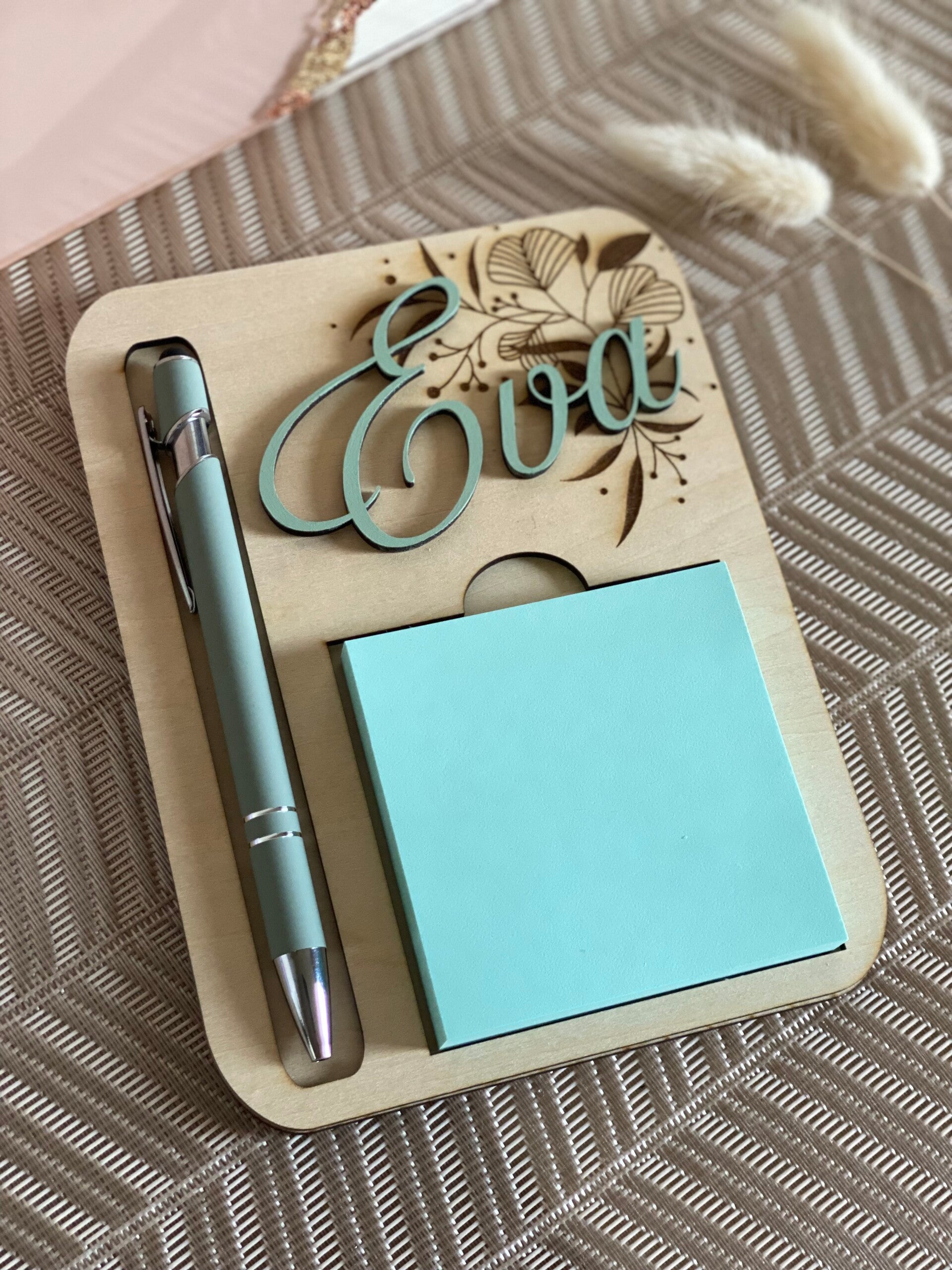 Apportez une touche unique et élégante à votre bureau avec ce porte-stylo et post-it en bois personnalisé. Chaque support est personnalisable par le prénom en 2D avec le stylo et le coloris de votre choix dans une typographie raffinée, créant un objet à la fois pratique et esthétique.